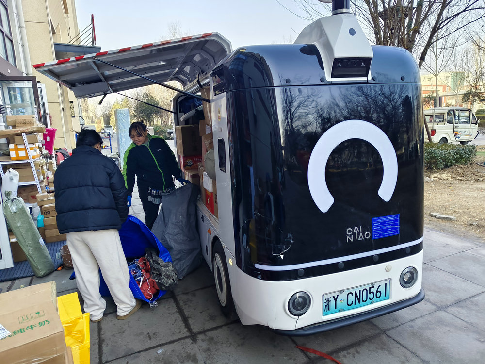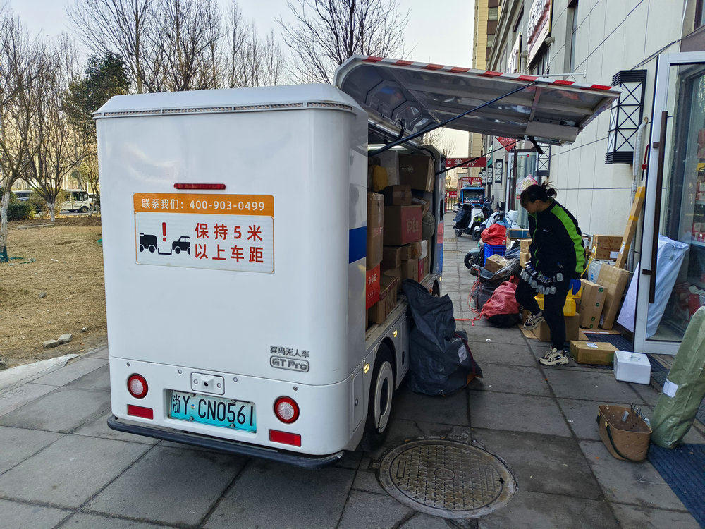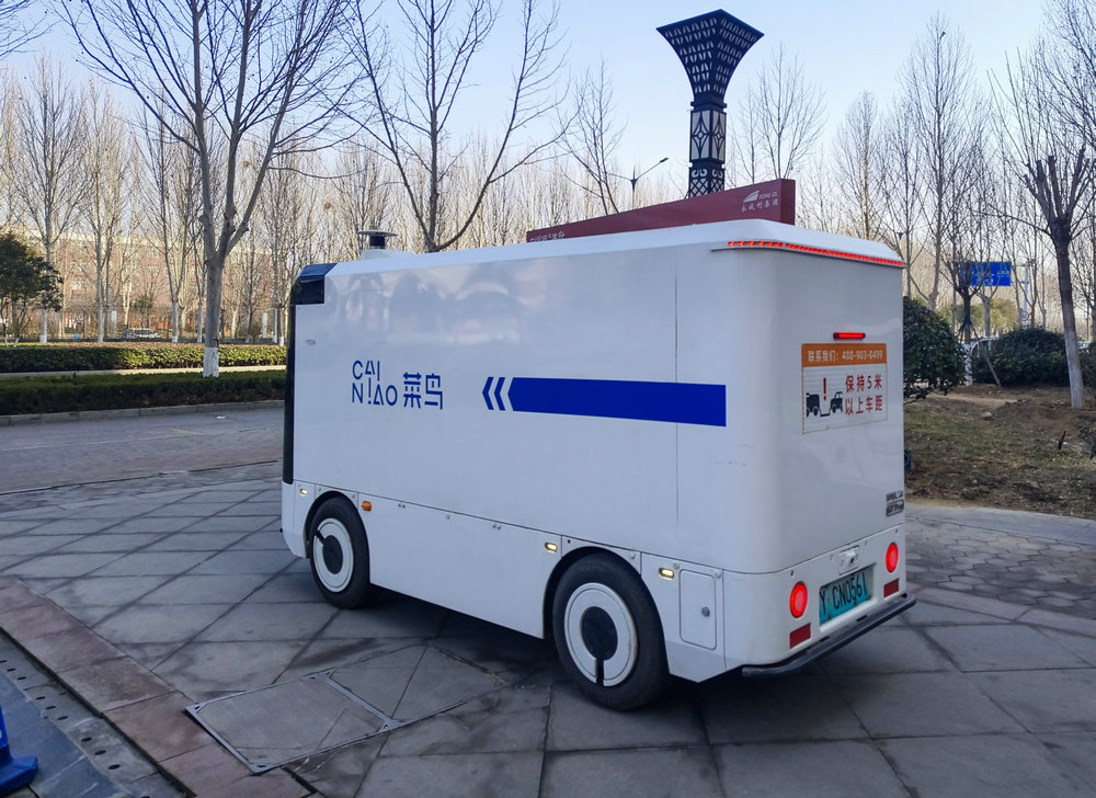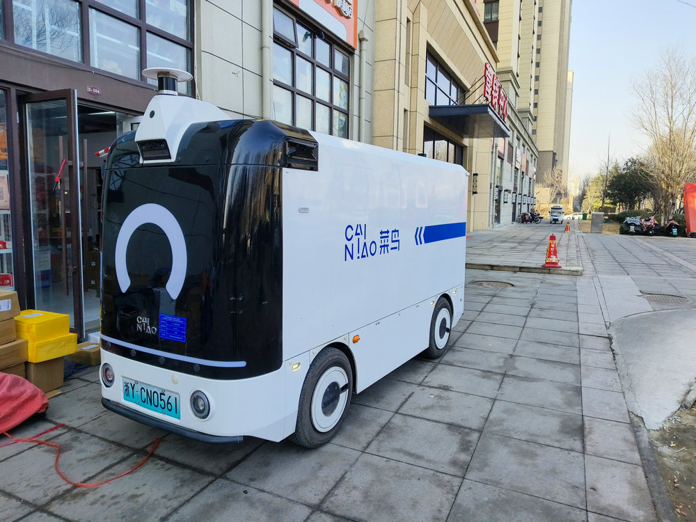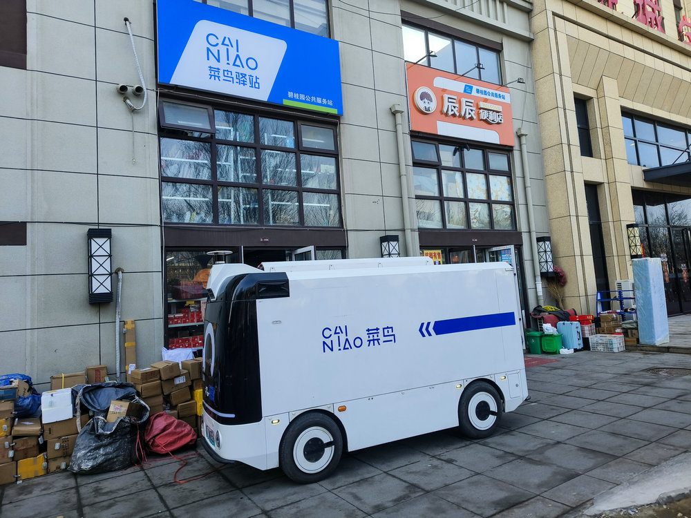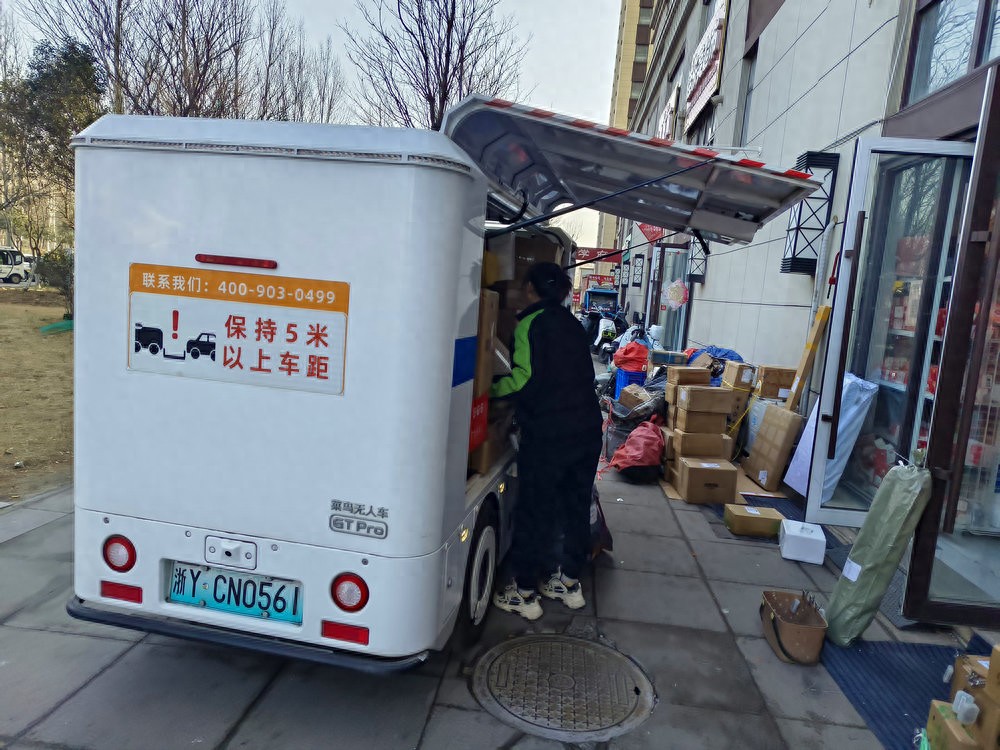 上午八点左右的宁阳县城还裹着淡淡薄雾,城东的一家快递站门前,一辆银灰色的无人配送车正安静地停在门口,车身上印着"菜鸟"的标识,像一只蓄势待发的机械甲虫,快递站人的正从车子一侧卸货。